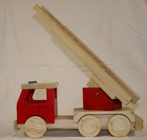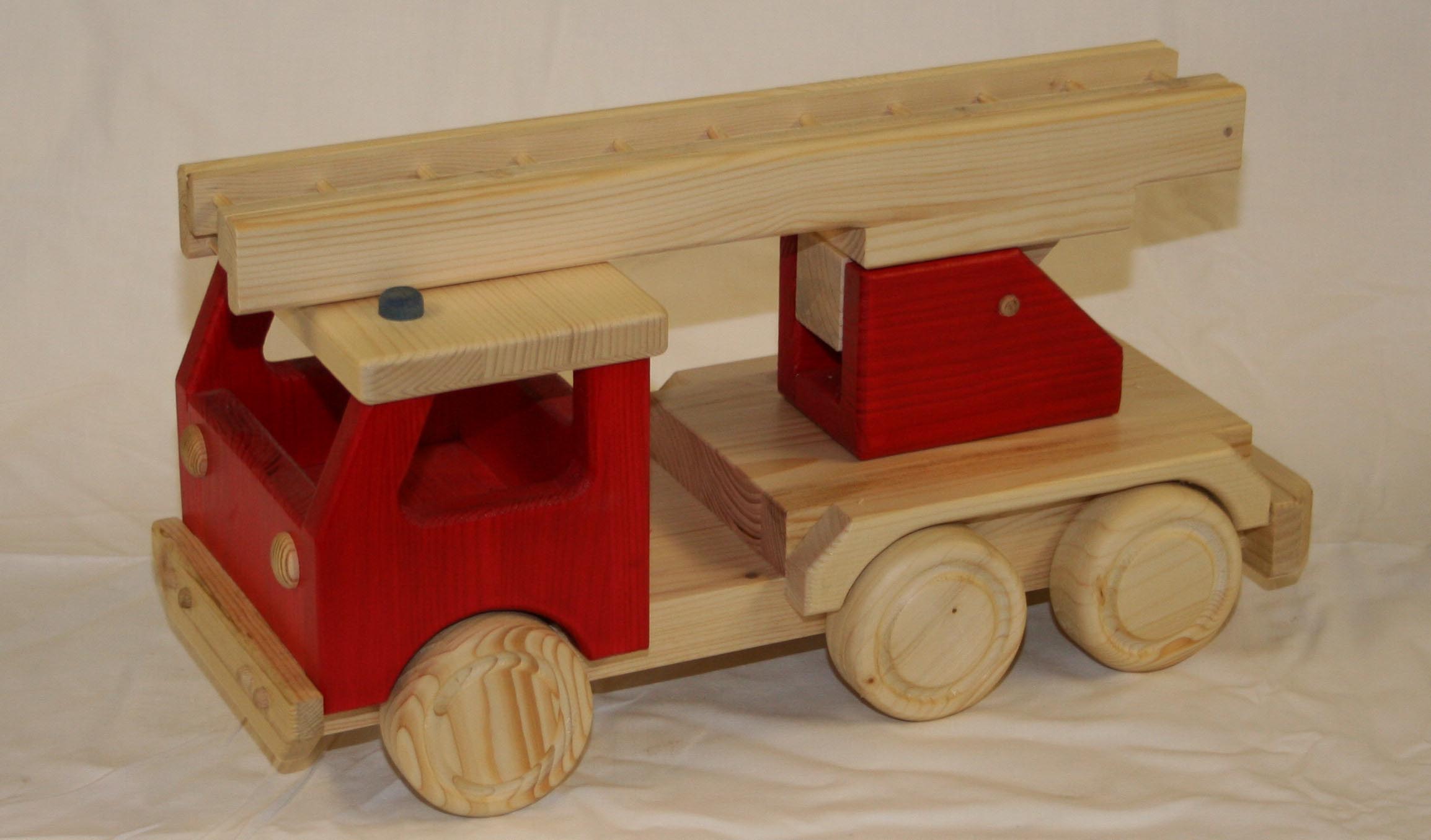 Der Holz LKW als Feuerwehr mit Drehleiter ist aus massiven Fichten- und Kiefernholz handgefertigt. Selbst die Räder bestehen aus Holz. Die Drehleiter läßt sich in allen Richtungen schwenken und ausziehen.