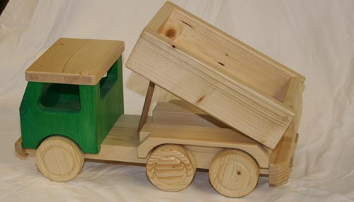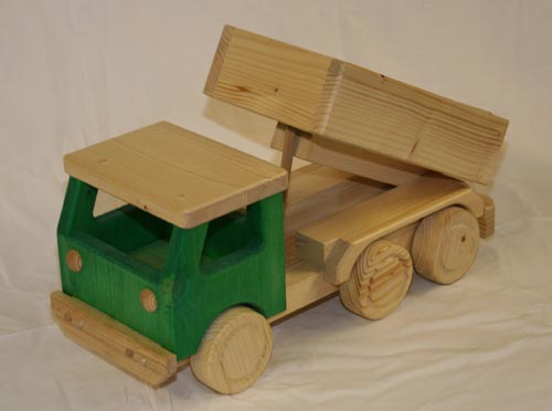 Der Holz-LKW zum abkippen mit grünem Führerhaus ist aus massiven Fichten- und Kiefernholz handgefertigt. Selbst die Räder bestehen aus Holz. Die Ladefläche läßt sich nach hinten abkippen. Die Holzoberfläche ist mit Wasserbeize und kinderspielzeuggeeignetem, wasserverdünntem Acryllack behandelt.