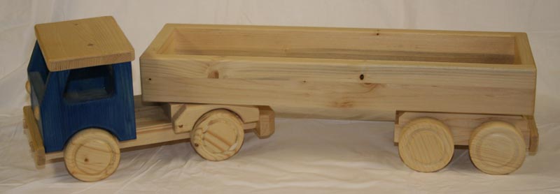 Der Holz LKW mit langen Auflieger zum abhängen sowie mit blauem Führerhaus ist aus massiven Fichten- und Kiefernholz handgefertigt. Selbst die Räder bestehen aus Holz. Die Holzoberfläche ist mit Wasserbeize und kinderspielzeuggeeignetem, wasserverdünntem Acryllack behandelt.